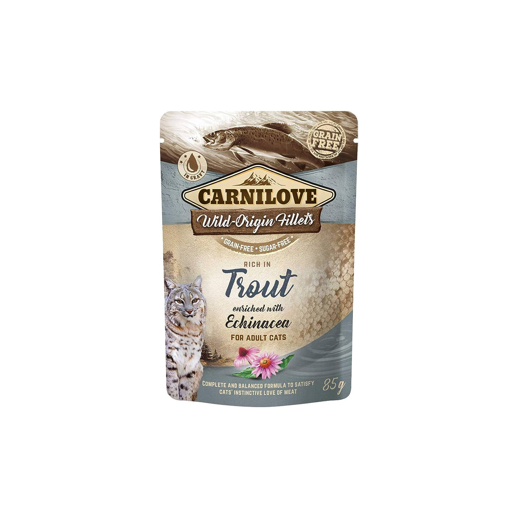 Highly nutritious trout meat to promote digestive tract health and optimal condition. Omega-3 fatty acids help maintain healthy skin, heart, and joints. Echinacea supports both nonspecific and specific immunity and has anti-inflammatory, antibacterial, and antiviral properties. It also promotes healthy skin and digestion and helps boost overall health. Complete Food or Delicious Topping for Kibbles. Unique Types of Meat. No Grains, No Potatoes, No GMO, No Soy, No Sugar, No Preservatives, No Colorants. Wild-Origin Fillets in Gravy.
