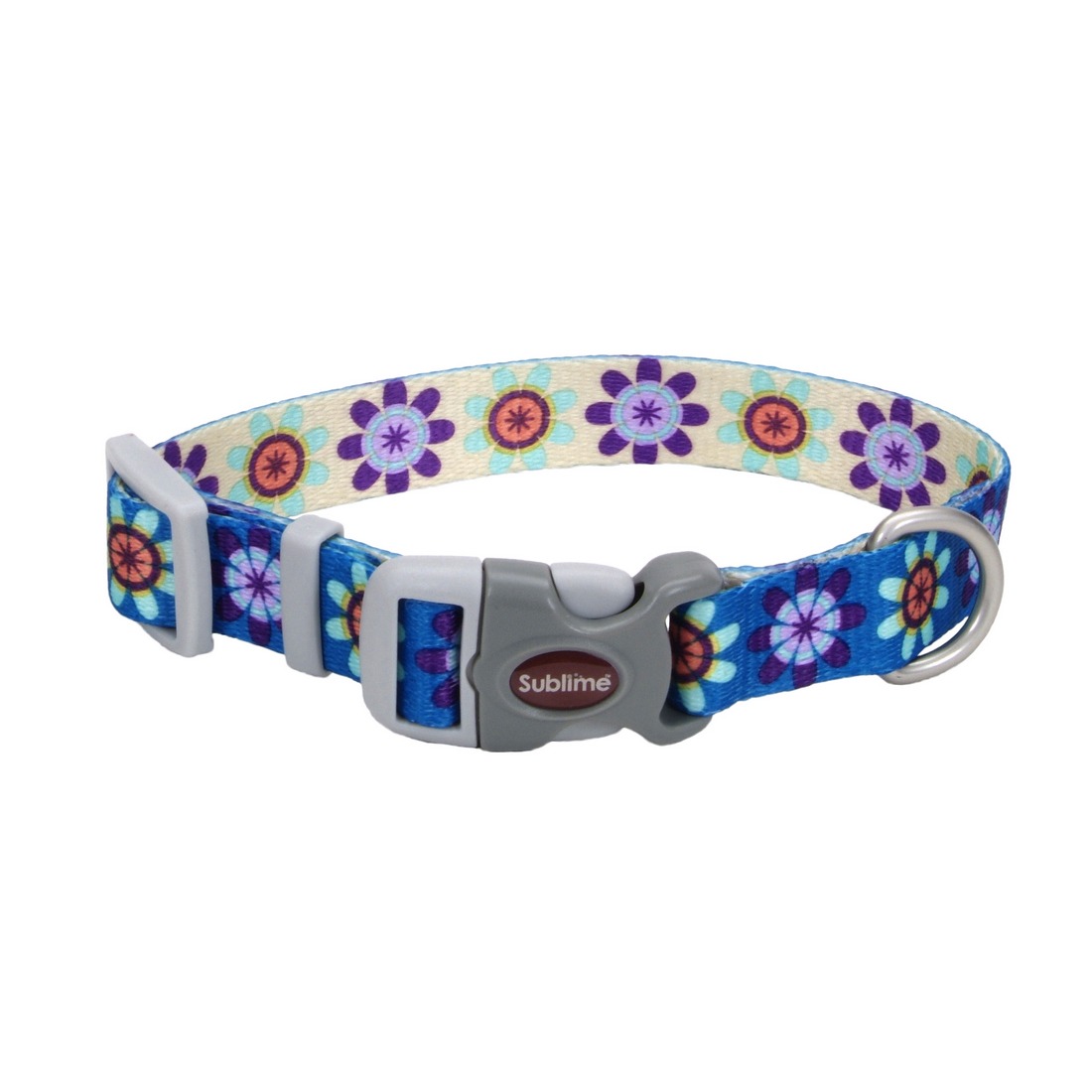 Our wider width Sublime Adjustable Dog Collar features two-sided complementary patterns and fashionable hardware for a bold statement. Sublime Adjustable Dog Collars come in fashionable patterns, each with a coordinating accent pattern on the opposite side. These dog collars feature unique and fashionable hardware and wider width to make a bold statement!