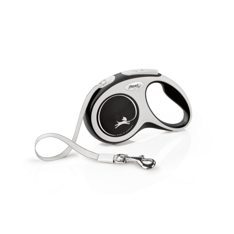 flexi New Comfort retractable lead size S , Tape 5 m, for dogs up to 15 kg, black. Accessorize your flexi New Comfort lead with LED Lighting System and/or Multi Box for treats or poop bags.