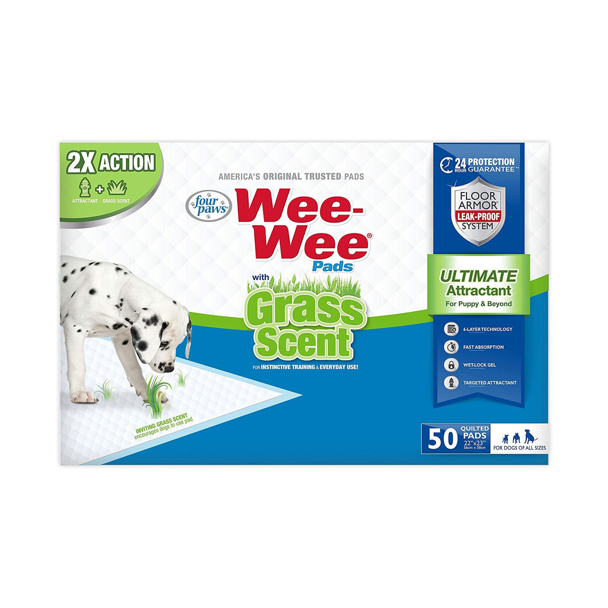 Four Paws has been providing the highest-quality pet products to keep fur friends happy, healthy, and clean since 1970. From the creators of America’s Original Trusted Pads, Wee-Wee Dog Pee Pads with Grass Scent are the perfect indoor potty solution for instinctive training and everyday use. Offering 2X action, these dog urine pads are enhanced with an inviting grass scent and feature exclusive targeted attractant that naturally draws dogs to the pad. No matter where your dog is trained to go potty, these scented dog pads are the ideal solution.