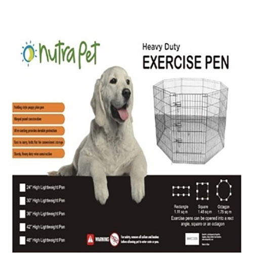 Nutrapet Lightweight Exercise Pen helps keep pets safely contained either indoors or out!Each pen is made with solid hinged construction and has secure locking clamps.All panels are 24″ wide and have a durable electroplated finish and come with 8 ground anchors for outdoor use. The pen is available in 5 different sizes to accommodate every type of need. Sets up in minutes and folds flat for easy storage.