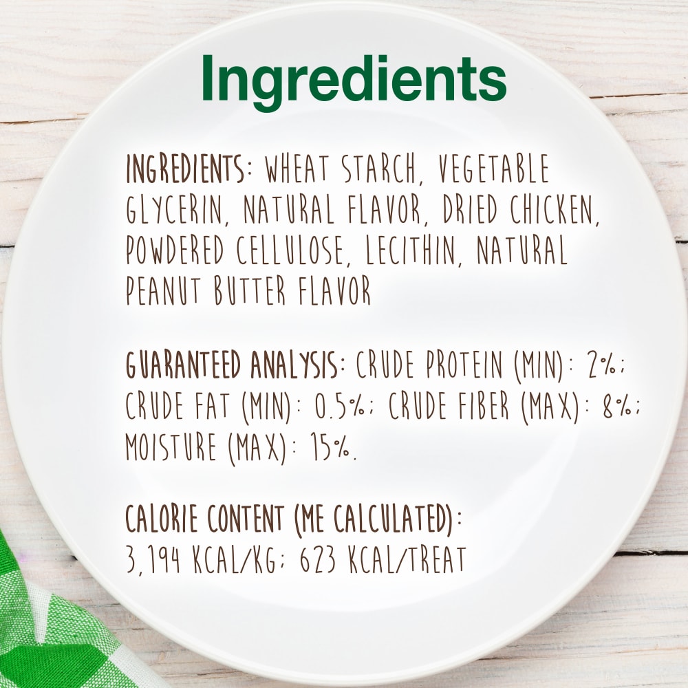 Wheat Starch, Glycerin, Potato Starch, Pea Protein, Natural Flavor, Rice Flour, Powdered Cellulose, Lecithin, Oat Hulls, Calcium Carbonate, Dried Chicken, Natural Roast Beef Flavor, Natural Bacon Flavor, Choline Chloride.