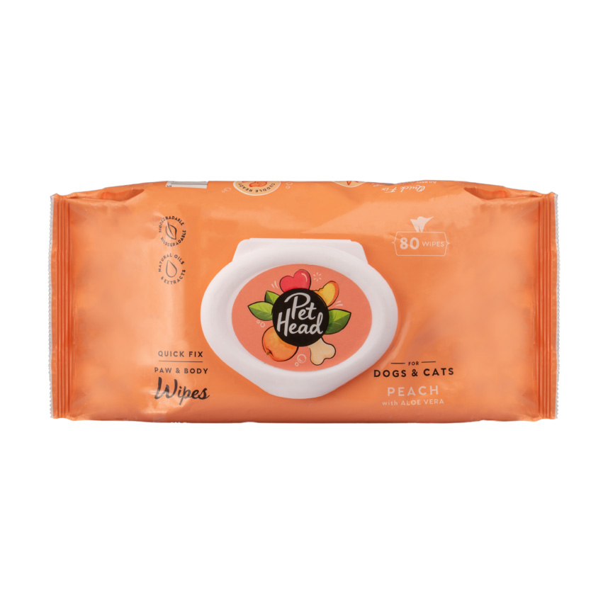Quick Fix – Dog & Cat Wipes – Wipe away the day! Suitable for both cats and dogs, our enriched peach wipes will get your cuddle companion freshened up in seconds. Containing our amazing peach fragrance, which is very popular, with a fruity note, sweet, nectarous and powdery it confers a softness and gentleness to our pooches. With natural oils & Extracts – Our quick fix wipes are packed with calendula and aloe vera to leave the coat soft and shiny whilst also using those rich soothing properties from our active ingredients. High quality ingredients – all Pet Head products are pH balanced, contain aloe vera & vegetable protein and are packed with natural and wholesome ingredients. All our fragrances are exclusive to Pet Head and were designed and formulated with rare & upmarket ingredients leaving your pooch smelling amazingly fresh & fruity. Directions – With these wipes you can clean up your pup’s paws after walks, freshen up their face, or wipe their booty as required. Safe – for you and your dog. All Pet Head products are free from all nasties – no parabens surfactants or dyes. Gluten & nut free for safety. We are transparent, all our ingredients are fully listed in our packaging. Pet Head is proudly vegan and cruelty free.