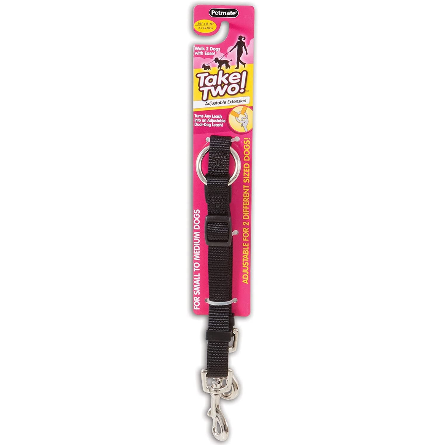 Take Two! makes walking two dogs at the same time a snap! The patented, Y-shaped dual dog leash features a tangle-free swivel joint that takes the frustrations out of walking two dogs at the same timeChoose from a standard handle or padded handle for added comfortTwo colors available as adjustable leashes, or couplers that can be added to any standard leashWorks with dogs of different sizes.