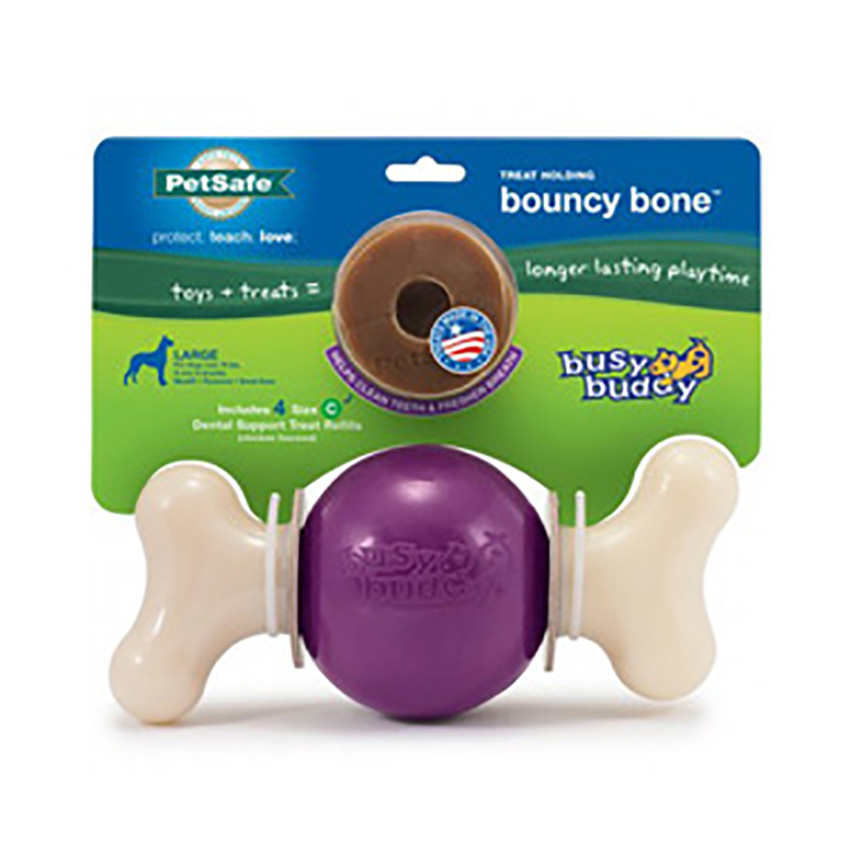 The Busy Buddy Bouncy Bone is 3 toys in one: nylon bone, rubber ball, and refillable treat-holding toy. Made from durable nylon and natural vanilla-scented rubber, this toy was designed to satisfy strong chewers. Treat ring refills reward good chewing behavior to encourage longer playtime. New chicken-flavored dental support treats are made in the U.S.A. and help clean teeth and freshen breath.Features For dogs over 6 months Durable nylon and rubber toy Includes 6 rawhide or 4 dental treat ring refills Dental rings are made in the U.S.A. and help clean teeth and freshen breath Additional rawhide, cornstarch, or dental treat ring refills available separately Dishwasher safe, top rack onlyMore InformationTo use, unscrew the Bouncy Bone. Slide a treat ring onto either side of the rubber ball, and then screw the bone back together.Treat Ring