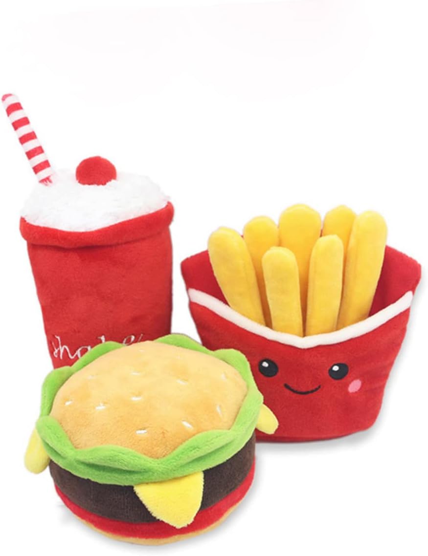 CUTE DESIGN: These fast food dog toys are so cute! The bright colors and adorable design will make it fun for both you and your pup. These plush toys are shaped as a burger, fries and milkshake.