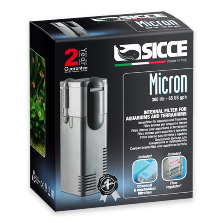 High-quality internal filter designed and manufactured by Sicce in Italy. Ideal for small aquariums and terrariums up to 75 liters of capacity. MICRON is equipped with a floating rotor system, integrated with an anti-wear and a unique system of controlling the flow of water that allows you to adjust the filtering based on the volume of water in the aquarium. The filtering action is carried out by a cartridge activated carbon and zeolite which ensures perfect cleaning of water for at least 30 days. Keeping at least one spare cartridge available is recommended.