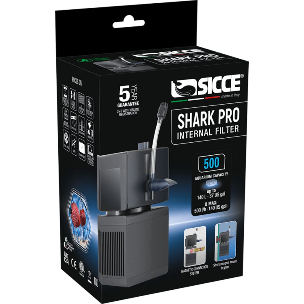 NEW range of internal filters with a very effective and high filtration volume which guarantee a crystal clear water in your tank. The SHARK PRO filters comes with a modular and flexible design. The filter can be used horizontally and vertically. The unique Sicce magnetic quick uncoupling system allows an easier manteinance operation. The filters are provided with an integrated aeration system and spray bar.