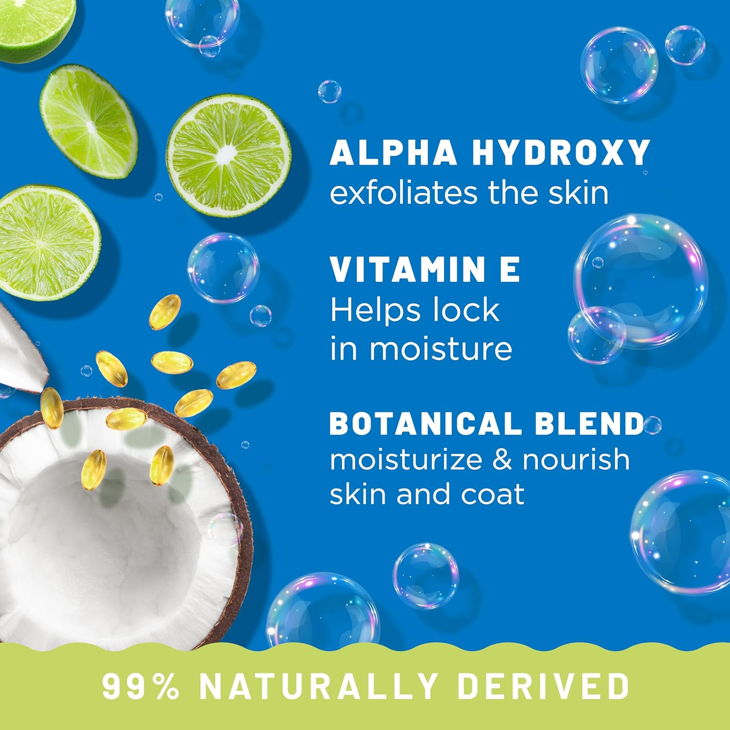 • Lime & Coconut Fragrance: Tropical, citrusy scent that leaves the skin and coat smelling fresh.
