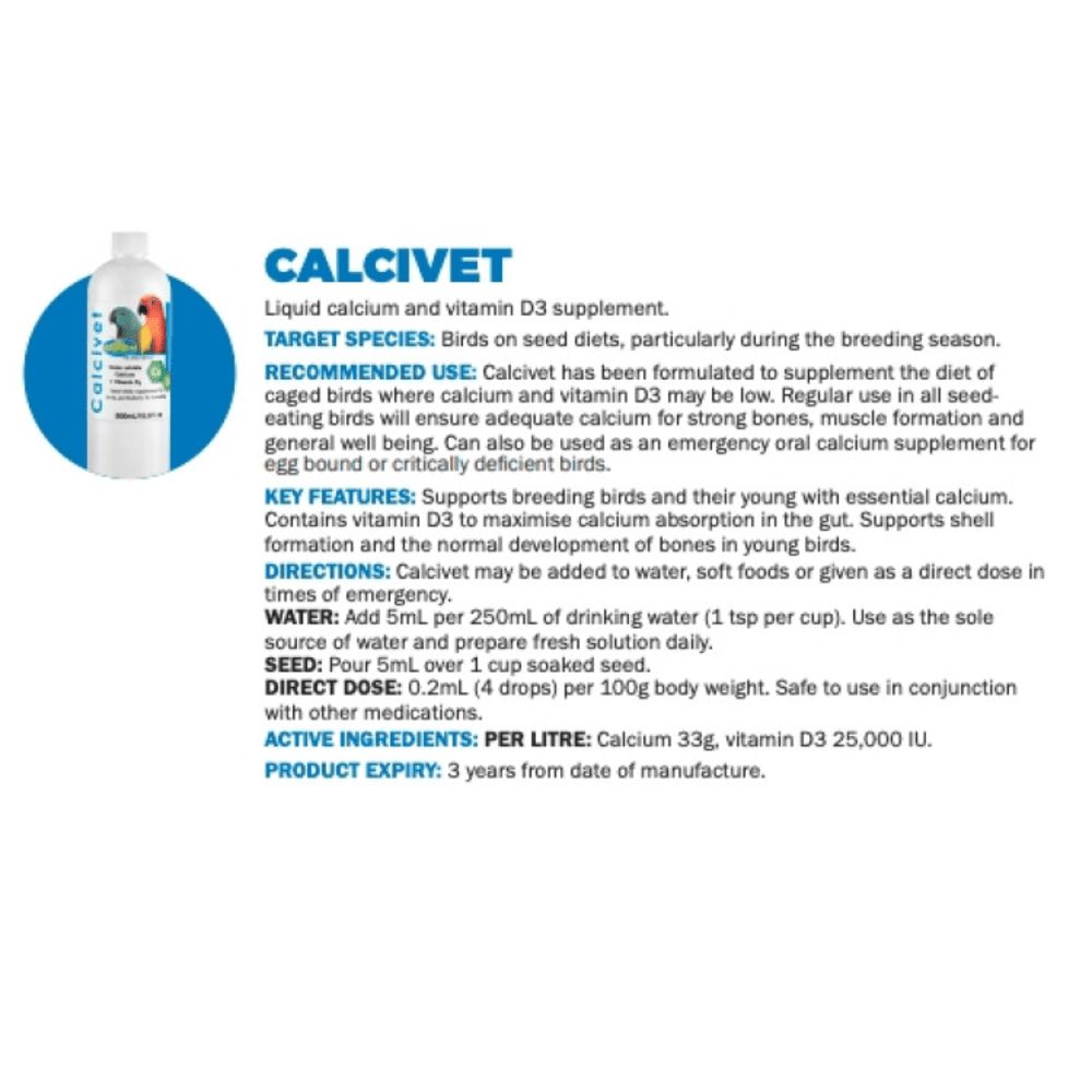 Please enable, see images in product master folder and put new tag for 2 months – DESCRIPTION – Key Features: Supports breeding birds and their young with essential calcium. Contains vitamin D3 to maximise calcium absorption in the gut. Supports shell formation and the normal development of bones in young birds. Regular use in all seed-eating birds will ensure adequate calcium for strong bones, muscle formation and general well being. Can also be used as an emergency oral calcium supplement for egg bound or critically deficient birds. Recommended For: All birds on seed diets, particularly during the breeding season. DIRECTIONS Water: Add 5mL per 250mL of drinking water. Use as the sole source of water and prepare fresh solution daily (1tsp per cup of drinking water.) strong>Seed: Pour 5mL over 1 cup soaked seed. Direct dose: 0.2mL per 100g body weight (Add 4 drops per 3½ oz body weight.)