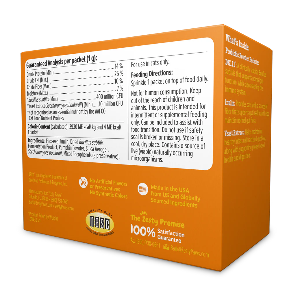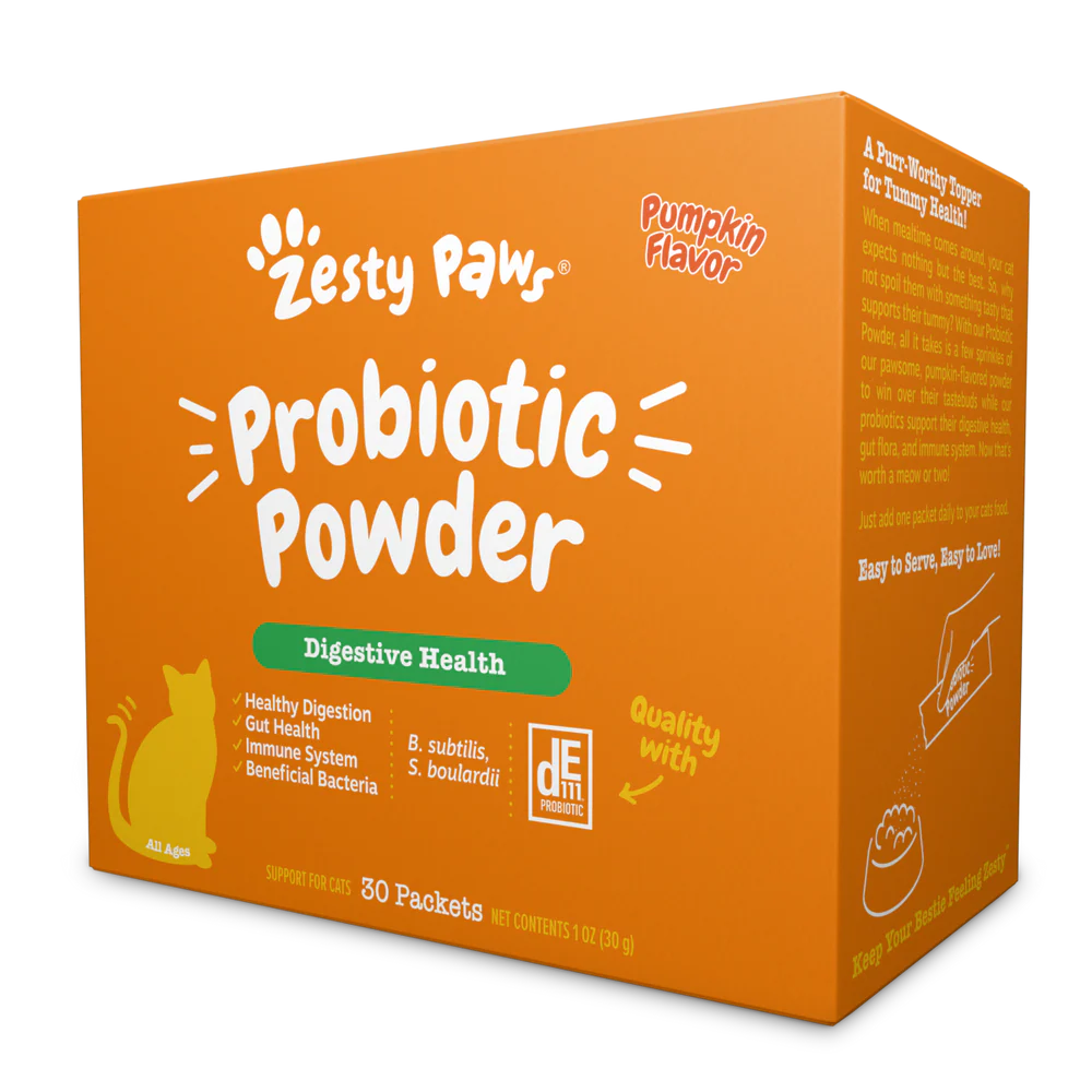 Zesty Paws Prebiotic Powder for Cats is a delicious and effective digestive supplement designed to support a healthy gut, immune system, and overall digestive wellness. This pumpkin-flavored powder combines the clinically studied DE111 Bacillus subtilis probiotic with prebiotic fiber (inulin) and yeast extract to promote healthy gut flora, bowel function, and digestion. Each single-serve packet contains 800 million CFU per serving, making it a convenient and highly effective supplement for cats of all ages and sizes. Simply sprinkle over your cat’s wet or dry food for an easy, tasty way to support digestion and immunity.