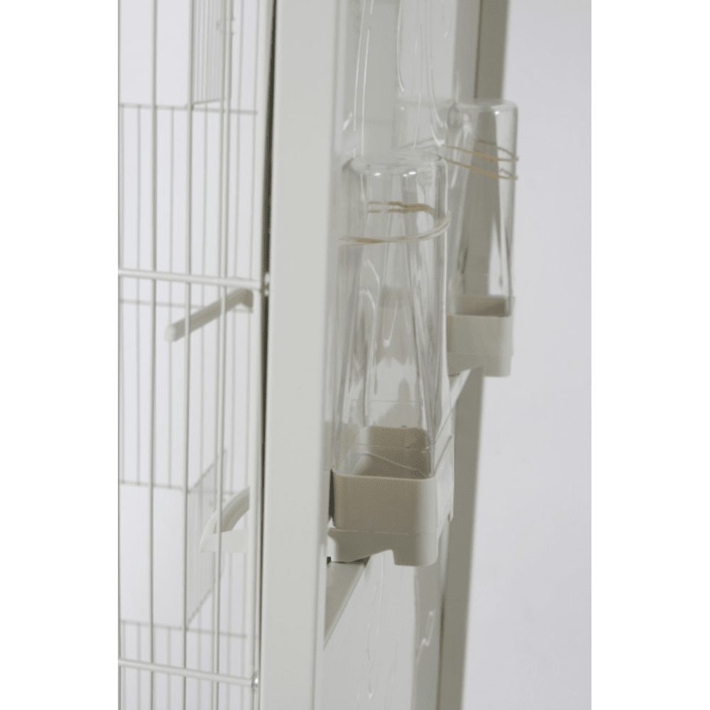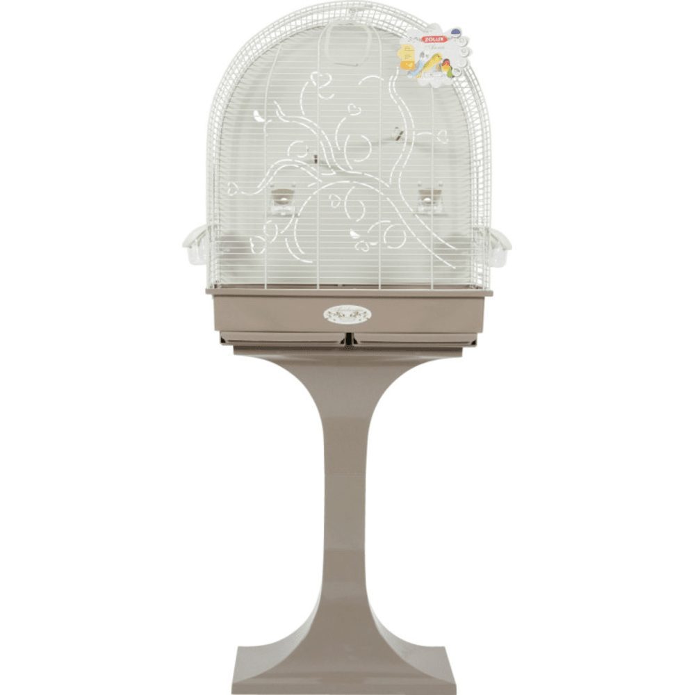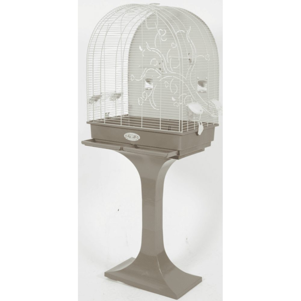 Bird cage with soft colors and supplied accessories perfectly integrated to focus on the beauty of your bird. Metallic background with arabesque decorations. Hygienic and easy to clean thanks to drawers. The cage is supplied with its own stand.
