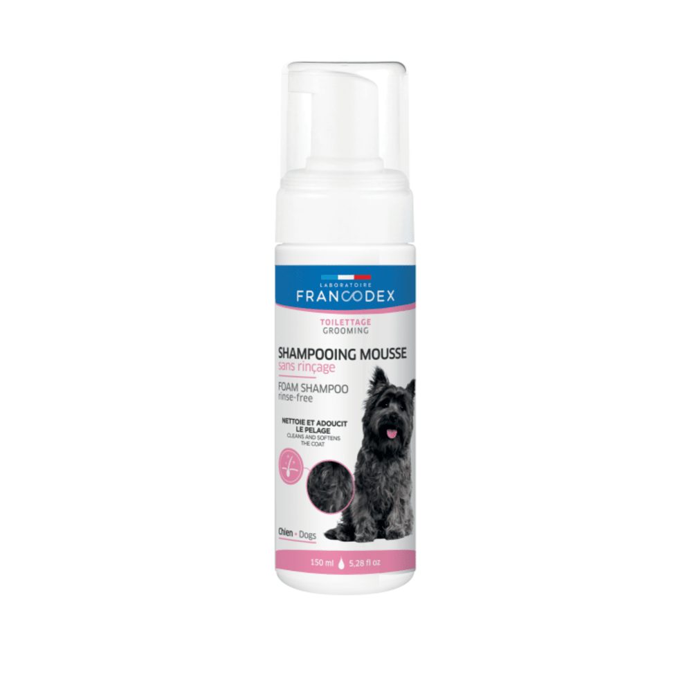 Formulated with chamomile extract with softening properties and glycerine with moisturizing properties, FRANCODEX RINSE-FREE FOAM SHAMPOO gently cleanses your pet’s coat.