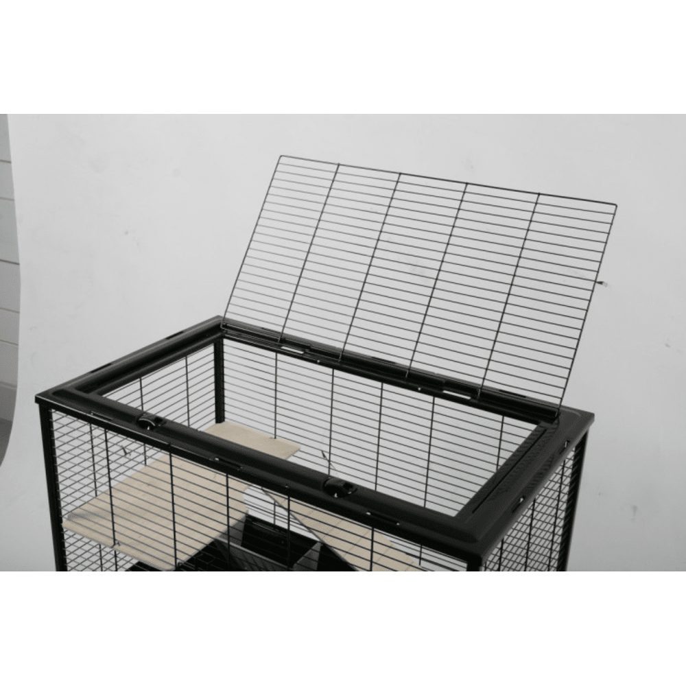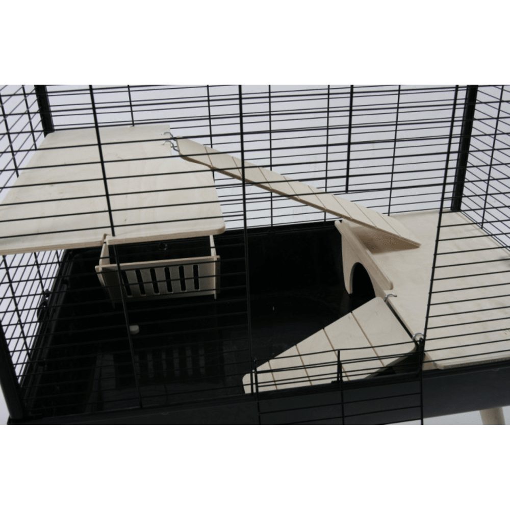 Trendy cage for large small animals designed on wooden feet. Adapted to each breed: bars are spaced according to the animal. Raised cage and levels provide animal a wider view of the environment. Large opening on the top and on the front to easily catch the animal. Finishing touches: solid wooden legs and “”NEO by ZOLUX”” is engraved on the first level. Made in Europe.